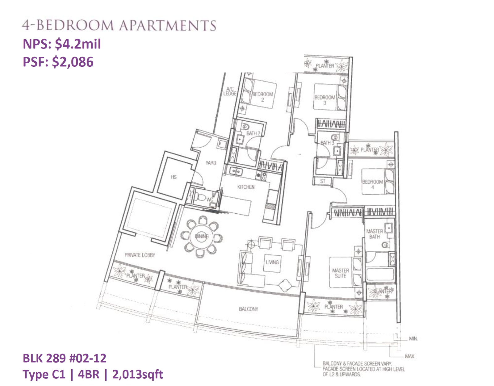 | 4 Bedroom | C1 | 2,013 | 1 | $4,200,000 |